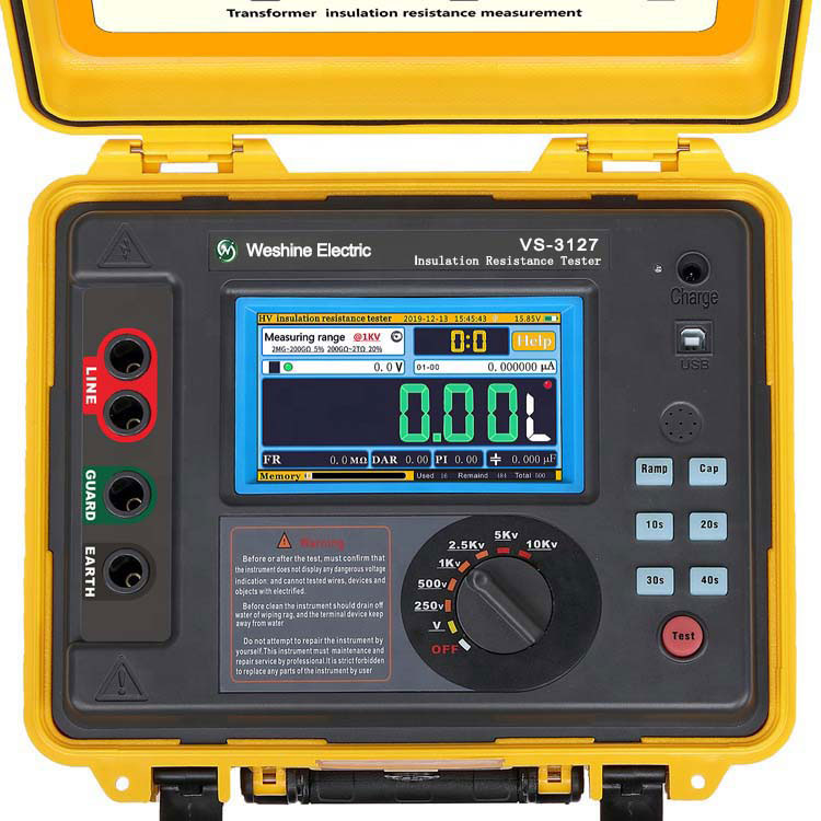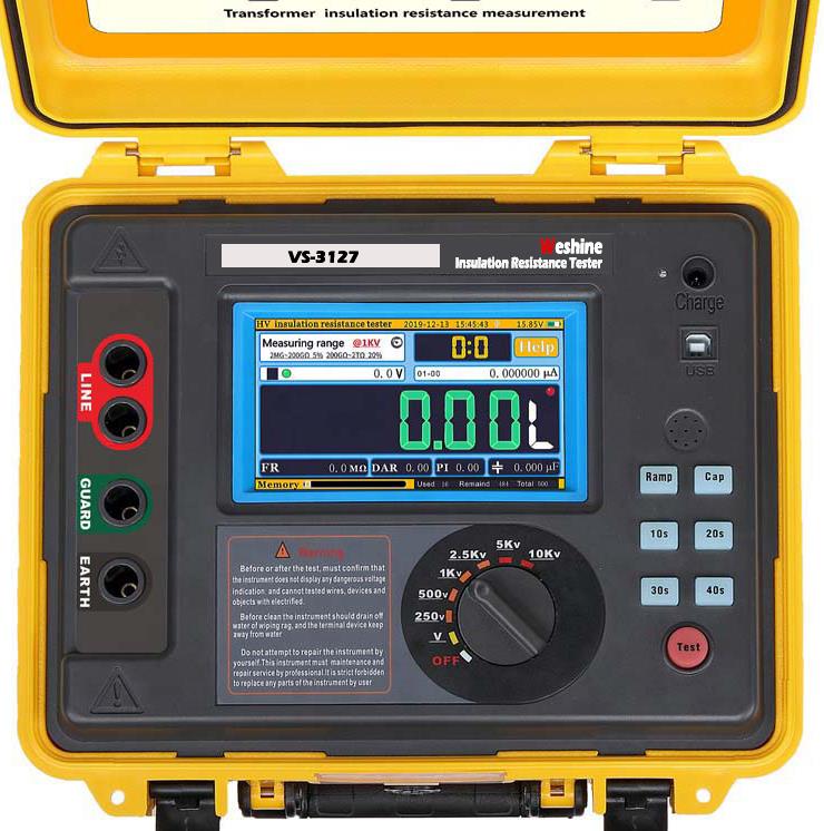 VS-3127 VS-3127ٹرانسفارمر کا پولرائزیشن انڈیکسزیادہ سے زیادہ 30 Tω کی زیادہ سے زیادہ مزاحمت کے ساتھ 15 KV ٹیسٹ وولٹیج تک درست موصلیت کے خلاف مزاحمت کی پیمائش کرنے کی صلاحیت پیش کرتا ہے۔ مزاحمت کی پیمائش کی درستگی 1 MΩ سے 3 TΩ سے 5 ٪ ہے! افادیت اور خدمت کمپنیوں کے لئے VS-3127 ایک آل راؤنڈ ٹیسٹر ہے جس میں اس کی لچک اور مستقبل کی ثبوت کی صلاحیت ہے۔ ویشائن بمقابلہ -3127 جہاں بھی آپ کام کرتے ہیں کام کرنے کے لئے ڈیزائن کیا گیا ہے۔ آؤٹ پٹ ریٹیڈ وولٹیج میکس 7 گیئرز (250V , 500V , 1KV , 2.5KV , 5KV , 10KV , 15KV) تک پہنچ جاتا ہے۔ زیادہ سے زیادہ شارٹ سرکٹ موجودہ 7MA موصلیت کے خلاف مزاحمت ٹیسٹ (IR) ، پولرائزیشن انڈیکس ٹیسٹ (PI) ، ڈائی الیکٹرک جذب تناسب ٹیسٹ (DAR)۔ ریمپ ٹیسٹ وضع (ریمپ) ، فلٹرڈ مزاحمتی ٹیسٹ وضع (ایف آر)۔ *کیپسیٹینس ٹیسٹ (کیپ.)۔ وولٹیج مانیٹر فنکشن ، ماپا کے براہ راست وولٹیج کی خود بخود نگرانی کرنا